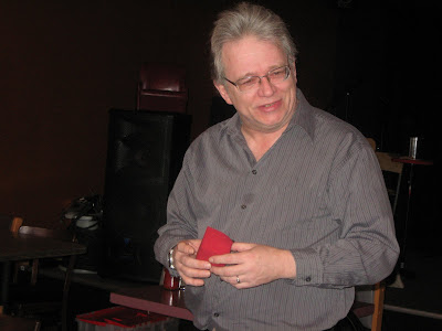I didn't bring any props but a deck or two of cards and some coins. Thinking fast I decided upon a trick simply known as "Card Box." I performed it flawlessly. Or not? Hmm. the fellow I chose to select a card for got his card, and at the revelation said, "no, that's not it."